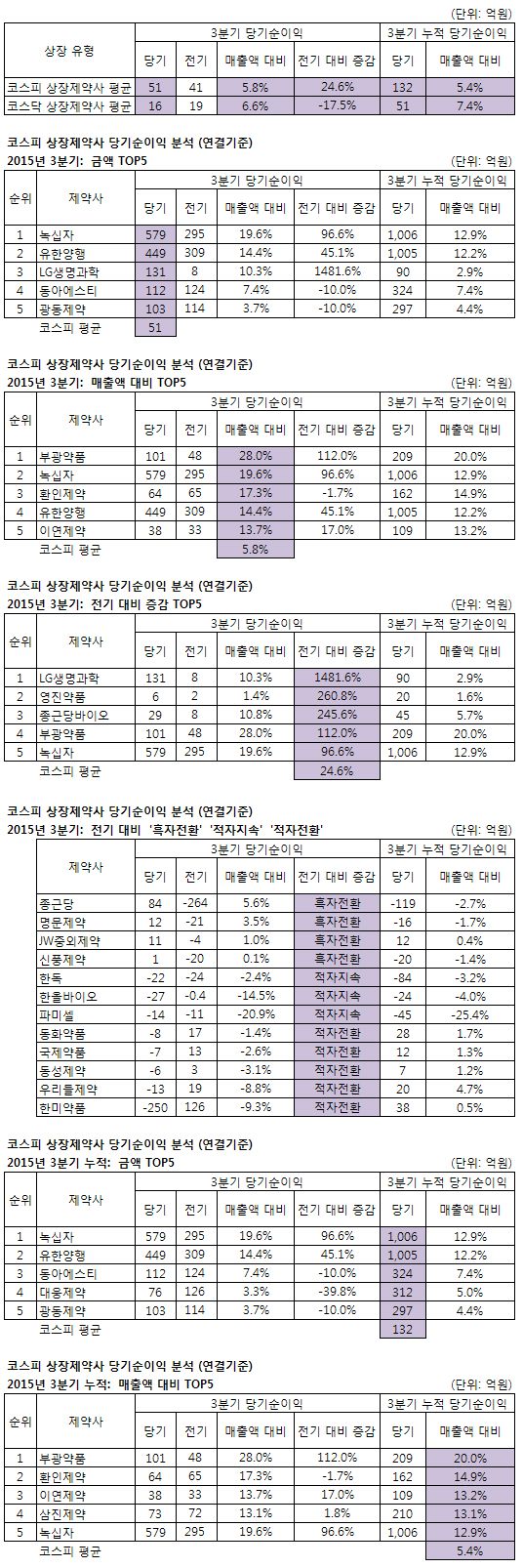 3분기 누적 순이익은 녹십자(1,006억) 유한양행(1,005억)이 1천억원을 넘었고, 매출액 대비 3분기 누적 순이익은 부광약품(20.0%) 환인제약 이연제약 삼진제약 녹십자로, 녹십자를 제외하고 중견 및 중소형 제약이 '톱5'를 차지했다.(평균 5.4%)