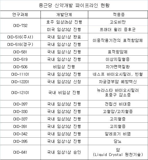 현재 종근당이 확보하고 있는 신약 파이프라인은 대부분 초기 임상단계에 머물고 있지만 다국적 제약사들이 관심을 갖고 있는 다수의 품목이 있는 평가이다.