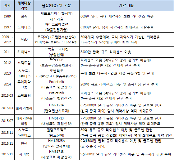 ◇ 기술수출 현황=지난 1989년 로슈를 시작으로 2015년 11월 자이랩사까지 총 13건의 기술수출 성과를 거뒀다.