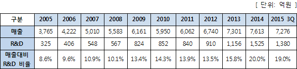 ◇ 연구개발=지난 15년간 누적 9천억대,지난 5년간 누적 5천억대를 R&D에 투자했다.