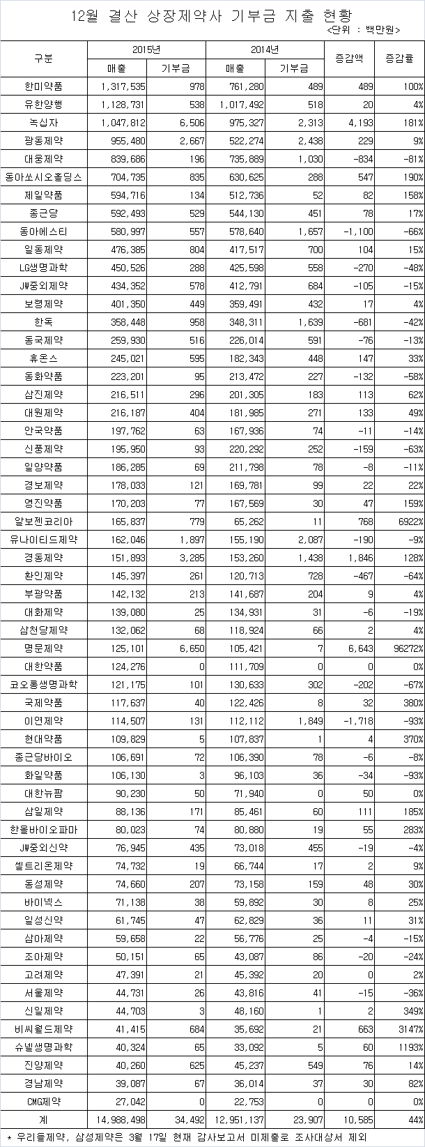 2014년 비교해 지난해 기부금 지출액을 가장 많이 늘린 곳은 명문제약으로 66억 4,300만원이었으며. 뒤를 이어 녹십자 41억 9,300만원, 경동제약 18억 4,600만원들의 순이었다.