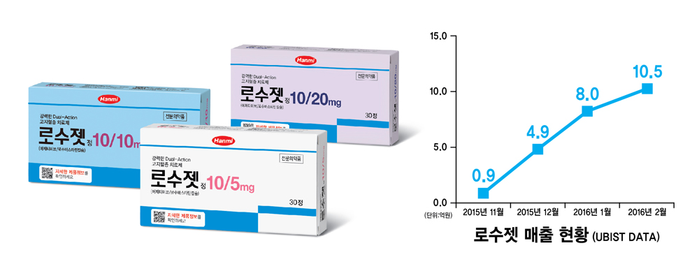 한미약품 마케팅 박명희 상무는 "로수젯은 국내 고지혈증 환자 400여명 대상의3상 임상(MRS-ROZE)을 통해 스타틴 단일제보다 우수한 효과를입증한 복합제"라며 “올해 블록버스터 품목으로 성장해 한미약품의 대표 제품이 될 것으로 기대한다”고 말했다.