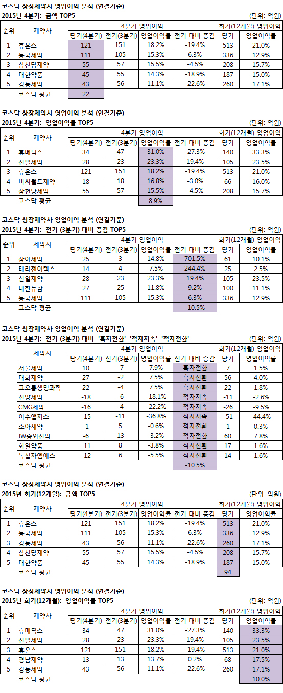 코스닥 상장 제약(26개사)=지난해 영업이익은 휴온스(513억) 동국제약(336억) 경동제약(260억) 삼천당제약(208억) 대한약품(187억)이 ‘톱5’에 들었다 (코스닥 평균 94억)