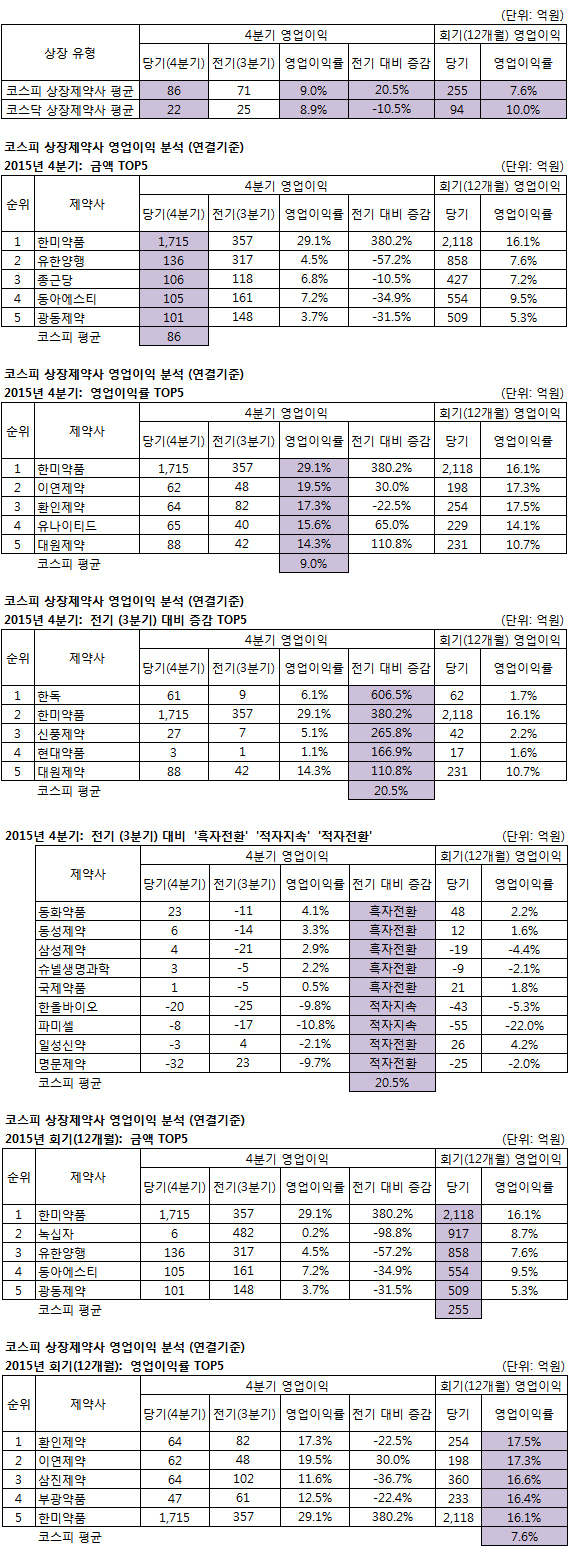 4분기 영업이익은 한미약품이 1,715억원으로 4분기에만 지난해 전체 영업이익(2,118억)의 대부분을 차지하며 톱에 올랐고, 유한양행 종근당 동아에스티 광동제약 순으로 나타났다. 지난해 전체 영업이익 2위였던 녹십자는 4분기 영업이익 ‘톱5’에 빠졌다.(평균 86억)