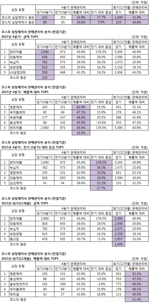 4분기 매출액 대비 판관비는 명문제약이 지난 회기 회사 매출액 대비 판관비(52.1%) 보다 높은 62.9%로 수위를 차지했고, 우리들제약 부광약품 동성제약 한미약품 등 '톱5' 제약사 모두 40%를 넘겼다 (평균 33.9%)