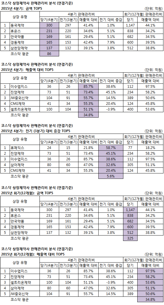 4분기만 놓고 볼 때, 판관비는 동국제약 휴온스 안국약품 경동제약 삼천당제약이 ‘톱5’에 들었다.