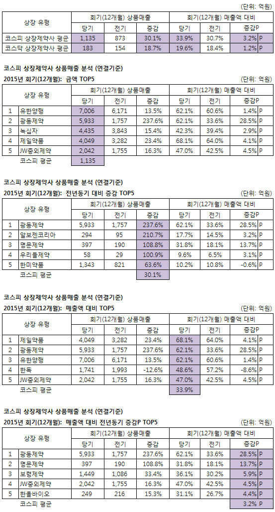 제약사별 지난해 상품매출= 유한양행(전기대비 835억 증가)은 ‘비리어드’(B형간염치료제, 198억) ‘스트리빌드’(HIV치료제, 93억) ’암비솜‘(항진균제, 84억) ’트라젠타 패밀리‘(당뇨병치료제, 54억) ’프리베나‘(폐렴치료제, 39억)등이, 광동제약(4,176억 증가)은 코리아이플랫폼(4,679억, 신규)이, 녹십자(591억 증가)는 ’바라크루드‘(B형간염치료제, BMS와 2015년 9월 1일 코프로모션)와 ‘알콕시아’(COX-2억제제, MSD와 코프로모션, 신규) 매출 증가분이 각각 작용했다.