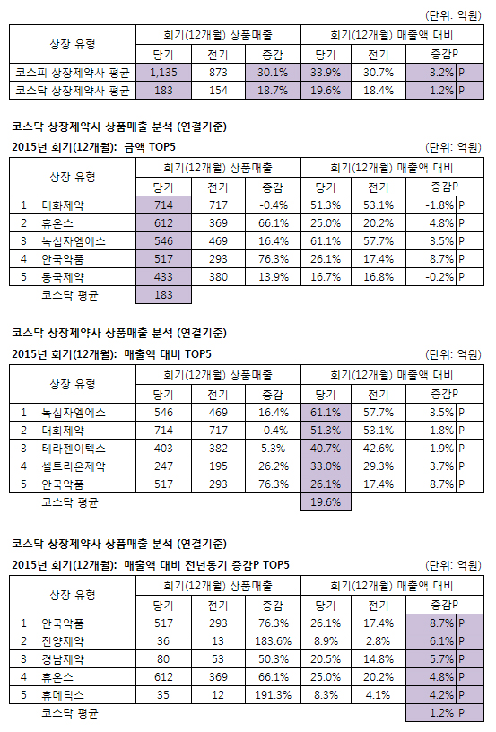 전기 대비 상품매출액 증감률은 코스피는 광동제약, 코스닥은 휴메딕스가 각각 가장 높았다.