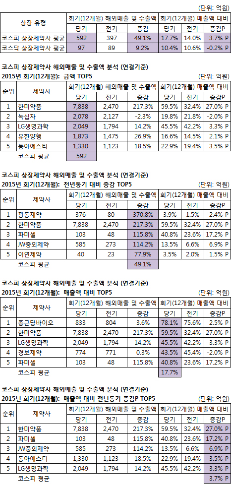 코스피상장 제약(36개사)=지난해 해외매출 및 수출액 ‘톱5‘는 한미약품(7,838억) 녹십자(2,028억) LG생명과학(2,049억) 유한양행(1,873억) 동아에스티(1,330억)로, 지난해 8조원 가까운 기술수출을 성공시킨 한미약품이 2, 3위를 3배 이상 앞섰다. (평균 592억)