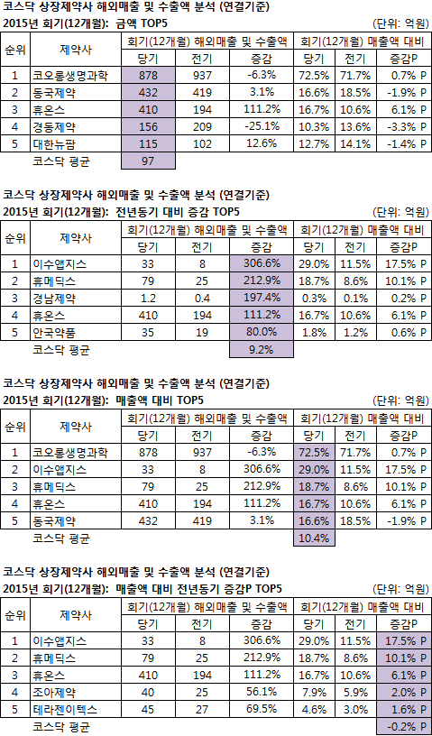지난해 전기(2014년) 대비 해외매출 및 수출액 증감률은 이수앱지스(306.6%, 전체 광동제약 이어 2위)로 가장 높았고 휴메딕스 경남제약 휴온스 안국약품이 ‘톱5’에 들었다.(평균 9.2%)