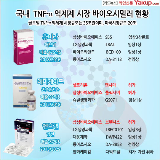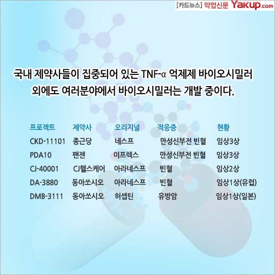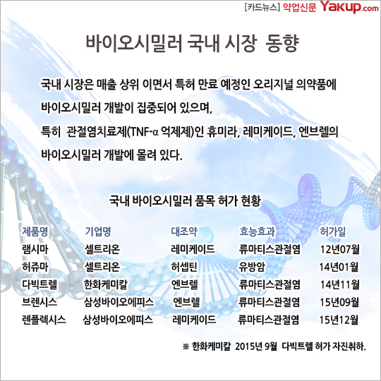 국내 시장은 매출 상위 이면서 특허만료 예정인 오리지널 의약품에 바이오시밀러 개발이 집중되어 있으며, 특히 관절염치료제(TNF-알파 엑제제)인 휴미라, 레미케이드, 엔브렐의 바이오시밀러 개발에 몰려있다.