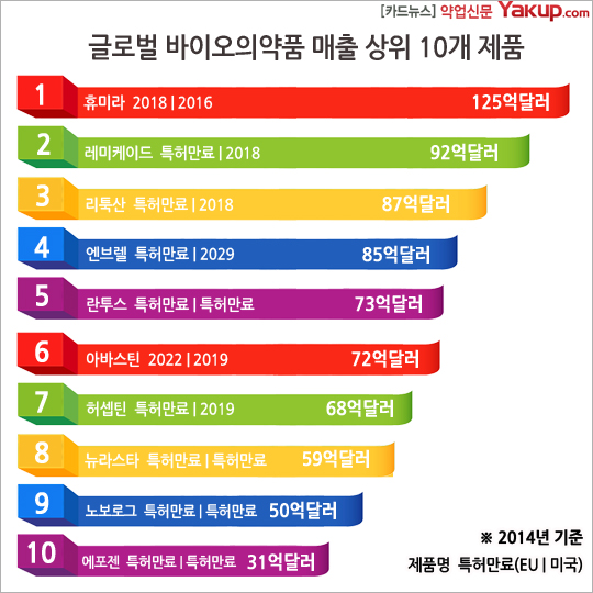 휴미라, 레미케이드, 리툭산, 엔브렐, 란투스, 아바스틴, 허셉틴, 뉴라스타, 노보로그, 에포젠