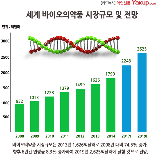 바이오의약품 시장규모는 향후 6년간 연평균 8.3% 증가하여 2019년 2,625억 달러에 달할 것으로 전망.