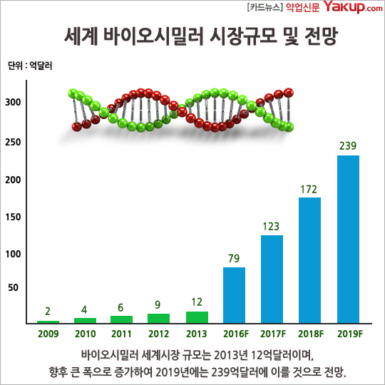 바이오시밀러 세계시장 규모는 2013년 12억달러이며, 향후 큰 폭으로 증가하여 2019년에는 239억 달러에 이를 것으로 전망.