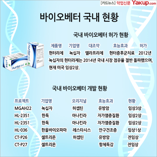 녹십자의 헌터라제는 2014년 국내 시장 점유율 절반 돌파하였으며, 현재 미국 임상2상.