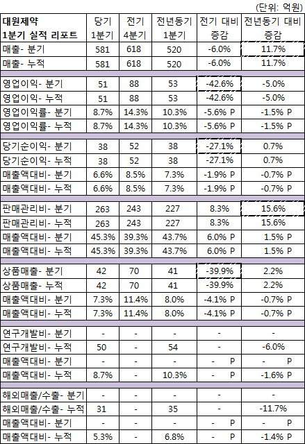 대원제약은 올해 1분기 매출 581억원을 달성, 전년동기(2015년 1분기) 대비 11.7% 성장했다고 공시했다. 전기(2015년 4분기)와 비교해서는 6.0% 감소했다.