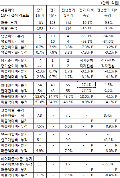 서울제약은 올해 1분기 103억원의 매출을 달성, 전년동기 대비 9.3% 감소했다고 공시헸다. 전기(2015년 4분기) 대비도 16.1% 감소했다.