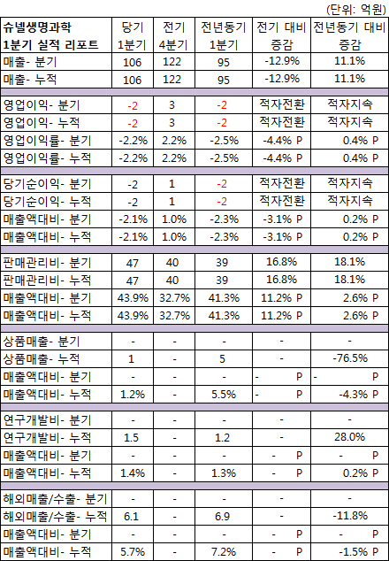 슈넬생명과학은 1분기 106억원의 매출을 달성, 전년동기대비 11.1% 성장했다고 13일 공시했다. 전기(2015년 4분기) 대비는 12.9% 감소했다.
