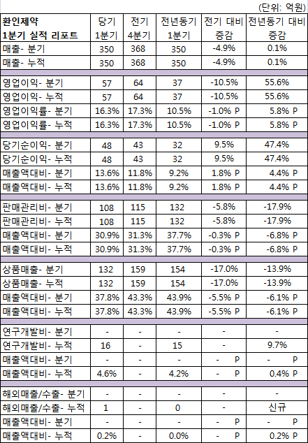환인제약은 1분기 350억의 매출을 달성, 전년동기대비 0.1% 증가했다고 13일 공시했다. 전기와 비교해서는 4.9% 감소했다.