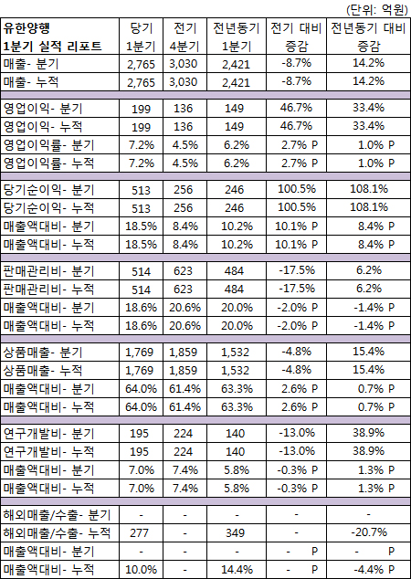 유한양행이 13일 공시한 바에 따르면 회사는 1분기 2,765억원에 매출을 달성, 전년동기 대비 14.2% 성장했다. 전기와 비교해서는 8.7% 감소했다.