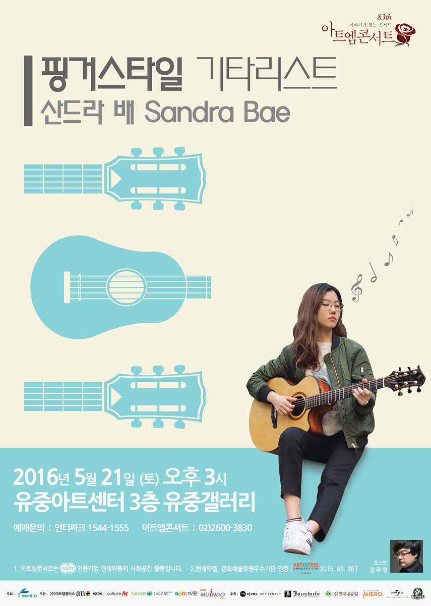 이번 아트엠콘서트에서는 핑거스타일 기타리스트 ‘산드라 배’가 출연해 가슴 따뜻해 지는 낭만적인 기타 연주를 선보인다. 핑거스타일이란 멜로디, 리듬, 화성의 음악의 3요소를 한 대의 기타만으로 표현하는 주법을 말한다.