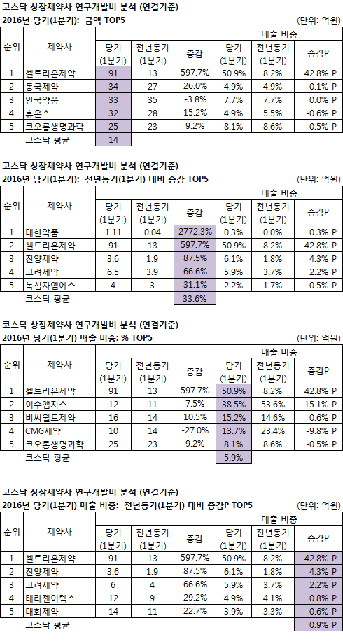 코스닥상장제약=1분기 연구개발비는 셀트리온제약이 91억으로 가장 많았고 동국제약 안국약품 휴온스 코오롱생명과학이 ‘톱5’에 들었다(평균 14억)
