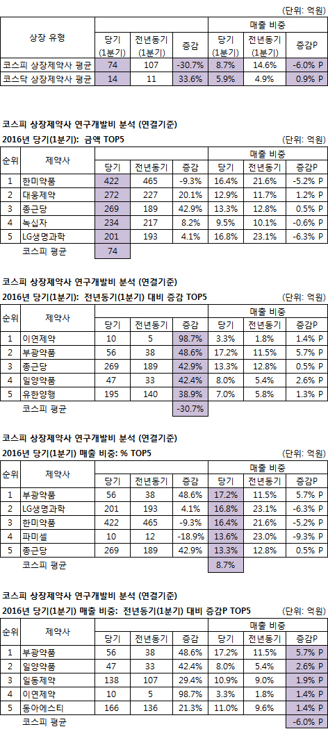 약업닷컴(WWW.YAKUP.COM)이 코스피상장 36개사와 코스닥상장 26개사의 1분기 전년동기대비 연구개발비를 분석한 결과 코스피는 평균 30.7% 감소한 반면, 코스닥은 33.6% 증가했다. 연구개발비는 코스피는 한미약품 코스닥은 셀트리온제약, 매출액대비 연구개발비는 코스피는 부광약품 코스피는 셀트리온제약으로 집계됐다.