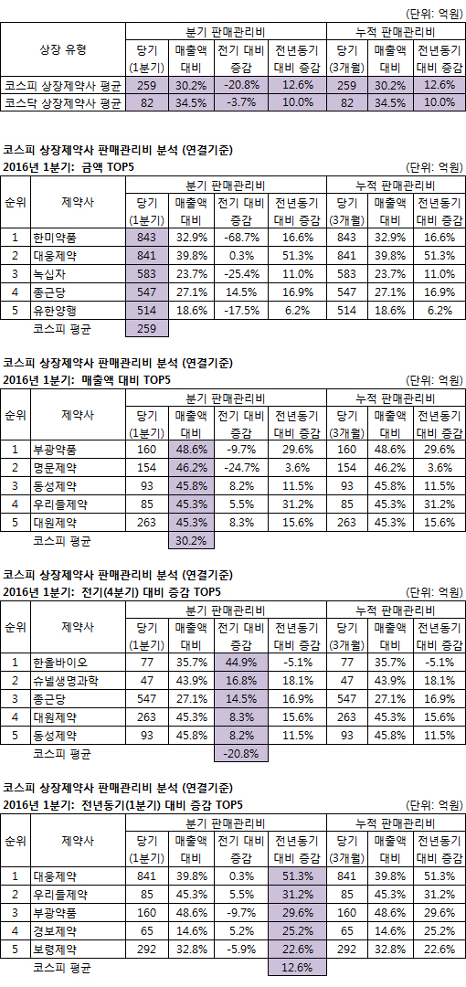 올해 1분기 상장제약사의 판매관리비가 코스피제약 코스닥제약 모두 전년동기대비 10% 이상 증가한 것으로 나타났다.
