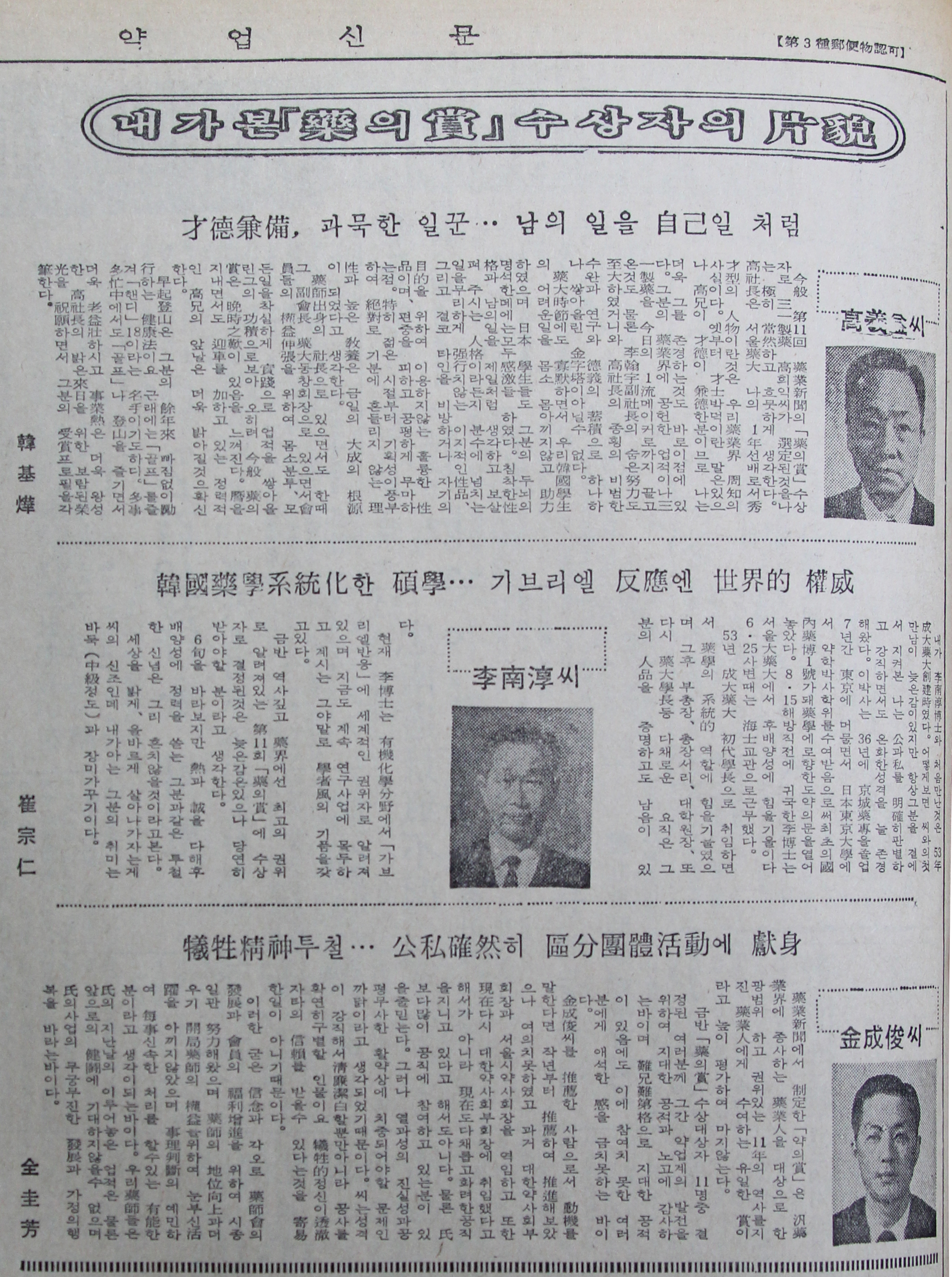 1957년 10월부터 1967년 8월까지 대한약품공업협회 부회장으로 재임하면서 한국 제약산업의 발전을 견인한 또 한사람의 큰별이기도 했다. 서울약대 동창회장을 맡아 쌓은 공적도 빼놓을 수 없다.