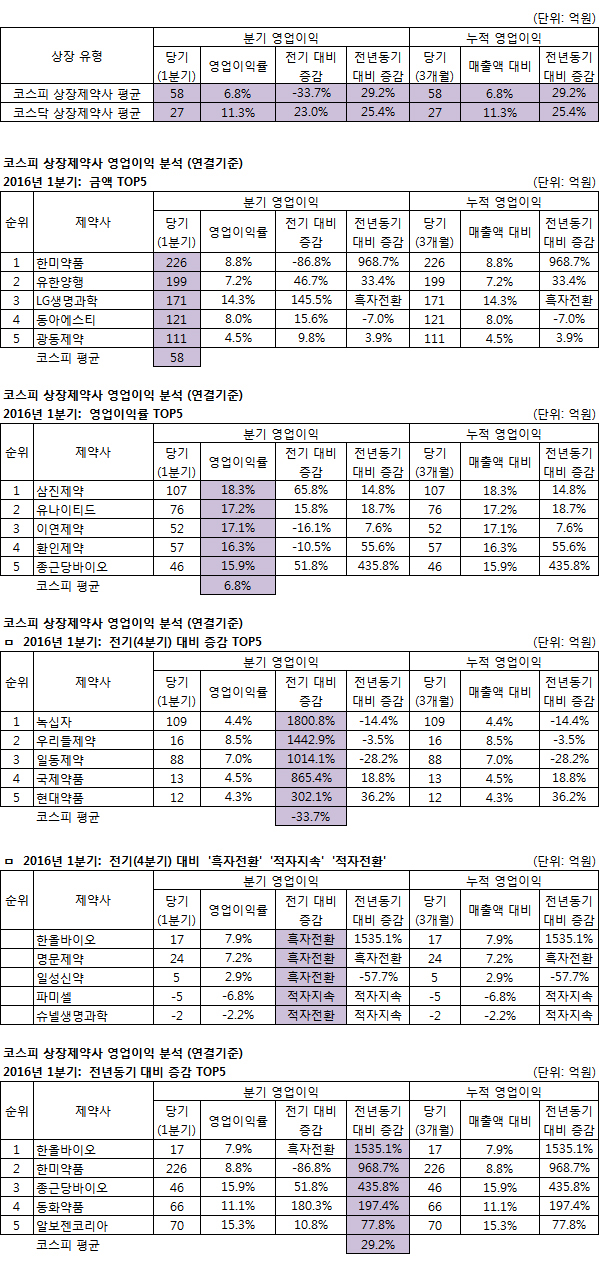 동아에스티는 판관비 17억 감소로 16억, 광동제약은 매출총이익 27억 감소 및 판관비 37억 감소로 10억, LG생명과학은 판관비 71억 감소로 101억, 일동제약은 판관비 76억 감소로 80억,국제약품은 매출 10억 증가로 12억,현대약품은 판관비 7억 감소로 9억 각각 증가했다.