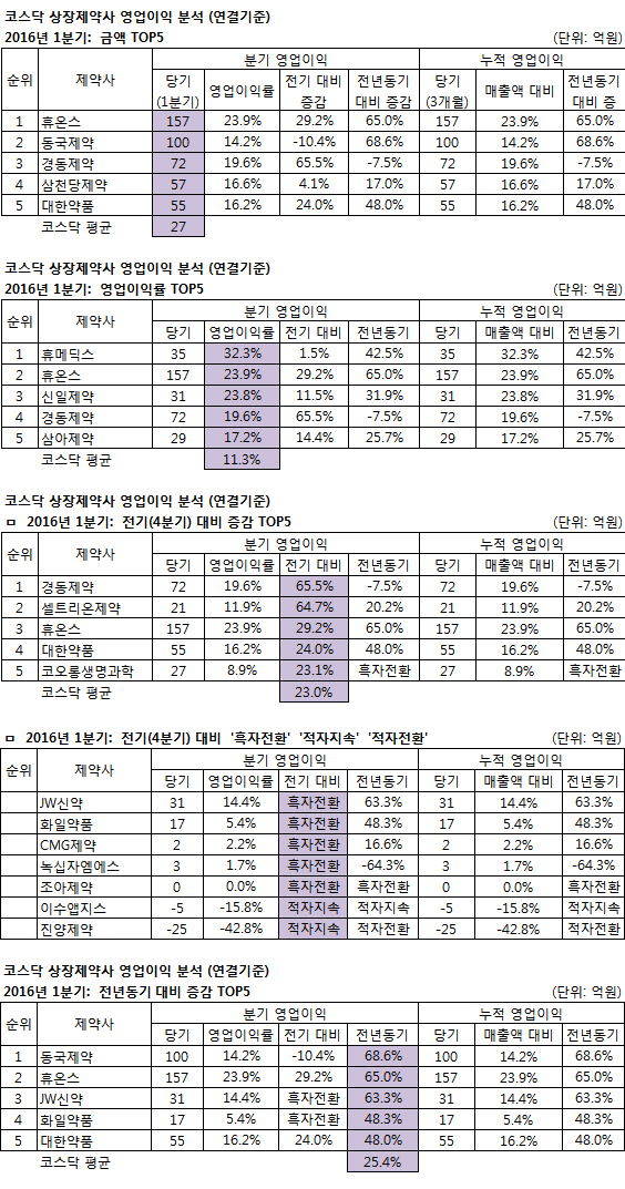 영업이익은 코스피는 한미약품 코스닥은 휴온스가 가장 많았고, 영업이익률은 코스피는 삼진제약 코스닥은 휴메딕스가 가장 높았다.