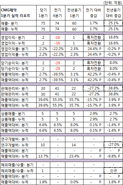 CMG제약은 1분기 75억의 매출을 달성, 전년동기대비 25.1% 성장했다.(제품매출 14억 및 용역매출 1억 증가로 15억 증가)
