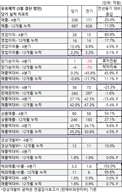 3월 결산 유유제약은 지난해 4분기 206억의 매출을 달성, 전년동기대비 20.4% 성장(35억 증가)했다고 공시했다. 12개월 누적 매출은 697억으로 전년동기대비 11.%%(69억 증가) 증가했다.