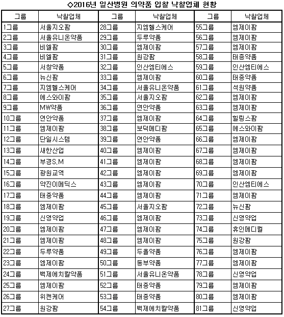 뉴신팜, 두루약품, 백제에치칼약품, 비엘팜, 서울지오팜, 에스와이팜, 지엠헬스케어 등 7개사는 2개 그룹씩 낙찰시켰다.