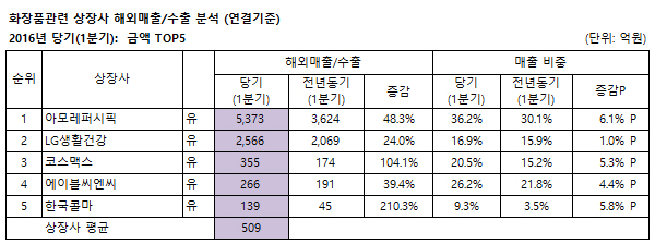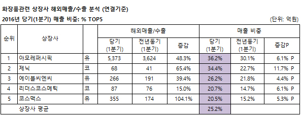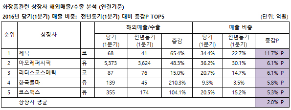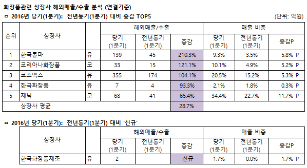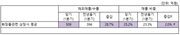 올해 1분기 화장품 관련 코스피 및 코스닥 상장사들의 해외매출/수출이 전년 대비 30%에 육박한 것으로 나타났다.