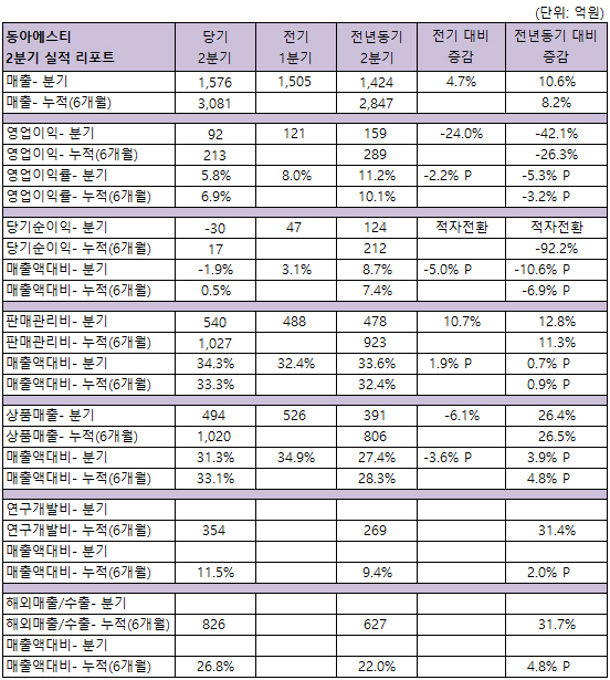 상반기 영업이익은 213억으로 전년동기대비 26.3%(2분기 92억, 전기대비 -24.0%) 감소했고 누적 당기순이익도 17억으로 전년동기대비 92.2% 줄었다(2분기 -30억, 전기대비 적자전환)