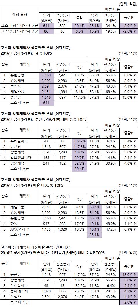 제약사별로 유한양행은 '비리어드‘(간염) 181억 증가, ’스트리빌드‘(에이즈) 122억 증가, '트라젠타’(당뇨) 98억 증가, ‘트윈스타’(고혈압) 66억 증가로 전년대비 539억 증가했고, 광동제약은 코리아이플랫폼(구매대행) 1천억(추정) 증가, 생수영업(삼다수) 82억 증가로 1,110억 증가했다.
