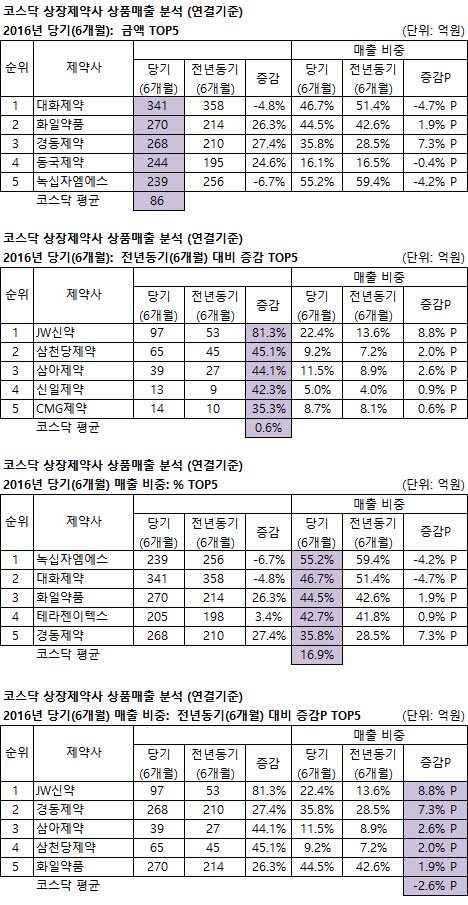 대화제약은 17억(의약품유통부문 17억 감소), 녹십자엠에스는 17억(혈액백류 감소분) 각각 줄었다.