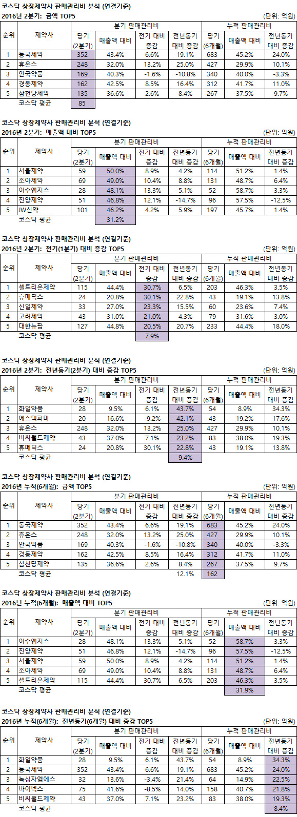 전기대비 증감률은 셀트리온제약(30.7%) 휴메딕스(30.1%)가 30%를 넘으며 1,2위를 차지한 가운데 2분기 판관비 ‘톱5’ 제약이 모두 빠지고 신일제약 고려제약 대한뉴팜이 ‘톱5’에 합류했다 (평균 7.9%)