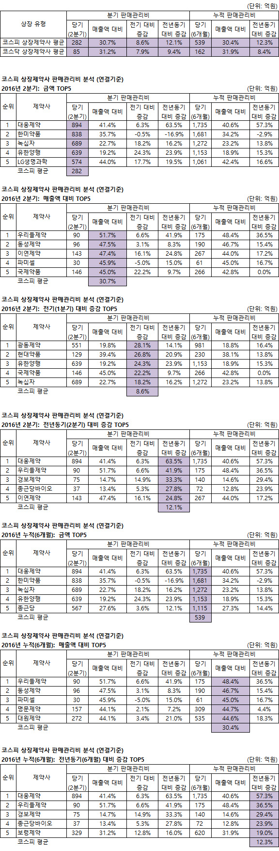 상반기 판관비는 코스피는 대웅제약 코스닥은 동국제약이 가장 많았고 전년동기대비 증감률은 코스피는 대웅제약 코스닥은 화일약품, 매출액대비 판관비는 코스피는 우리들제약 코스닥은 이수앱지스가 가장 높았다.