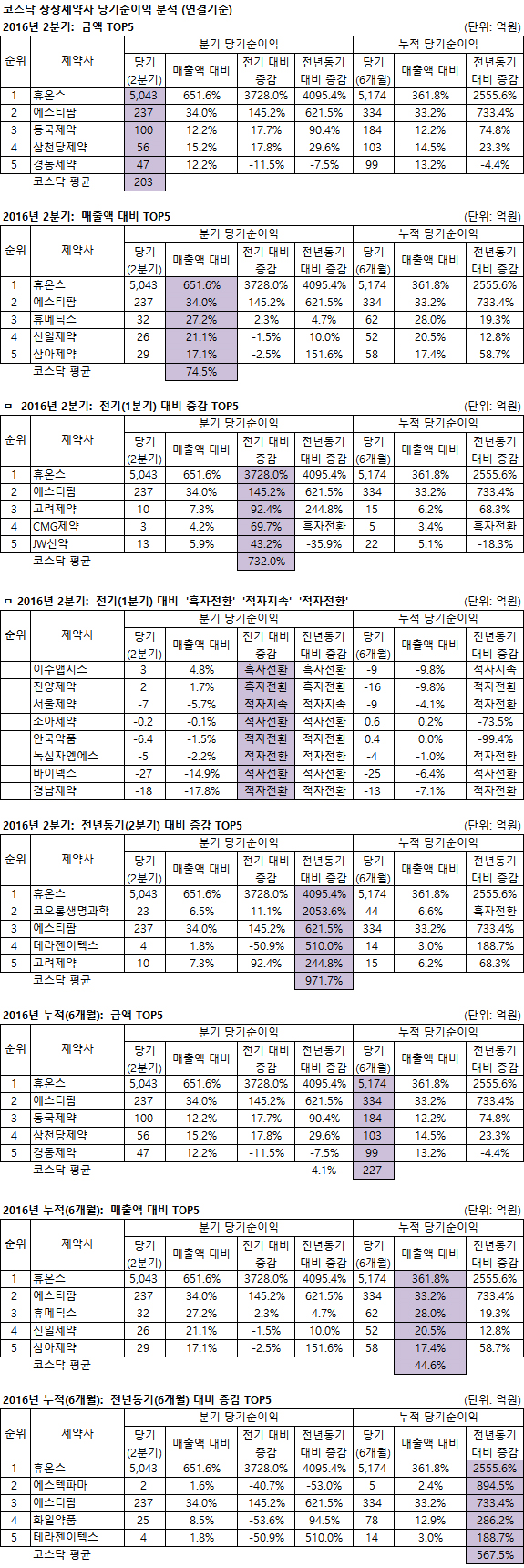 제약사별(2분)= 전기대비 휴온스는 4,911억(중단영업처분이익 4,918억 발생-2016.5.1 지배기업 분할), 에스티팜은 140억(영업이익 225억 증가, 금융자산처분이익 45억 감소, 법인세 45억 증가), 고려제약은 5억(영업이익 6억 증가), CMG제약은 1.4억(영업이익 1.2억 증가), JW신약은 4억(영업이익 8억 감소, 투자자산처분손실 5억 감소, 이자비용 2억 감소, 잡이익 2억 증가, 법인세 2억 감소) 각각 늘었다.