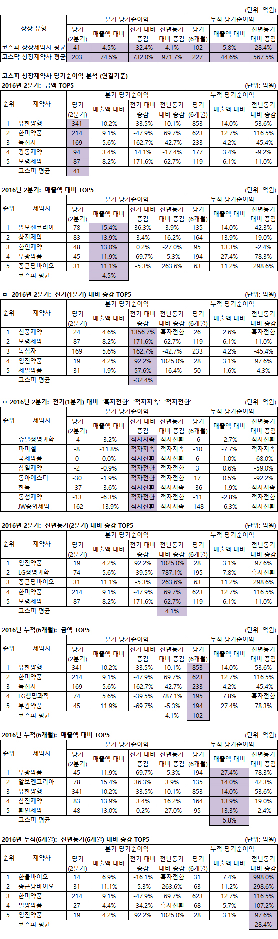 상반기=전년대비 한올바이오는 28억(영업이익 22억 증가, 이자비용 5억 감소), 종근당바이오는 47억(영업이익 63억 증가, 법인세 12억 증가, 환율변동손실 7억 증가), 한미약품은 335억(외환차익 128억 증가, 경상개발비 126억 감소, 판관비 51억 감소), 일양약품은 35억(영업이익 30억 증가, 잡수익 3억 증가), 영진약품은 14억(영업이익 14억 증가) 각각 늘었다.