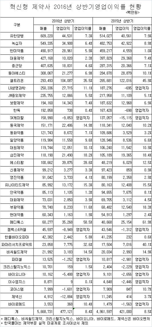 약업닷컴(www.yakup.com)이 정부로부터 혁신형 제약기업으로 인증받은 46개업체중 상장제약사 37개사의 2016년 상반기 영업실적을 분석한 결과, 이들 제약사의 매출액 대비 영업이익률은 평균 8,4%로 나타났다.