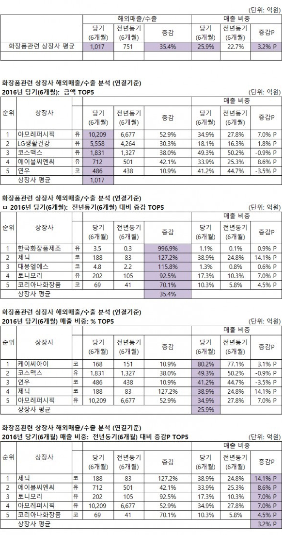 금액면으로는 아모레퍼시픽(1조 209억원), 증가율로는 한국화장품제조(996.9%↑)가 각각 1위를 차지했다.
