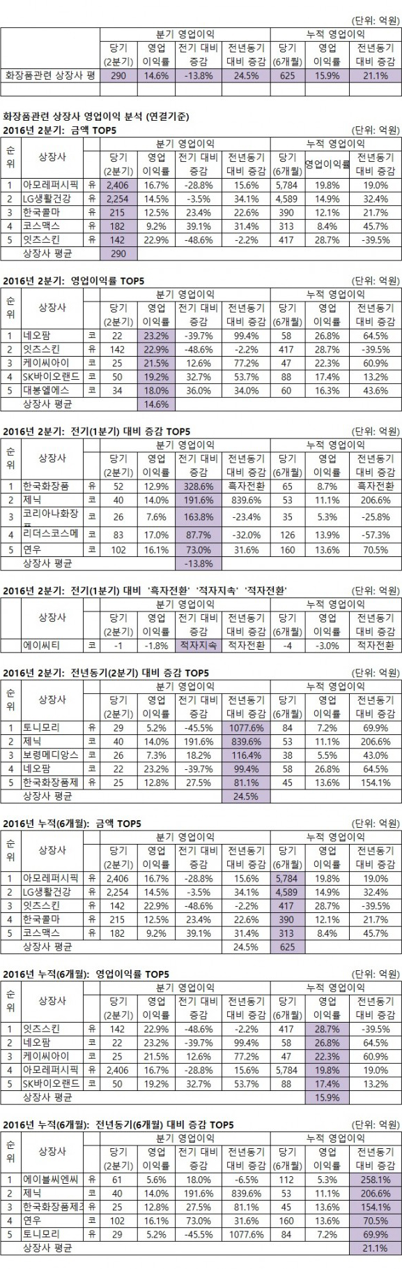 금액 기준으로 전기(1분기) 대비는 한국화장품(328.6%), 전년 동기(2분기) 대비는 토니모리(1077.6%)가 가장 큰 폭으로 상승했다.