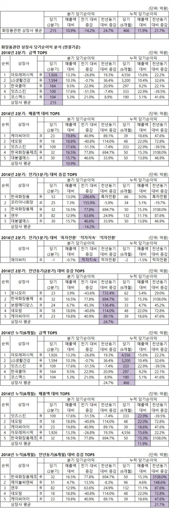 22.1% 상승한 297억원을 기록한 한국콜마가 4위, 41.6% 증가한 190억원을 기록한 코스맥스가 각각 5위에 올랐다.