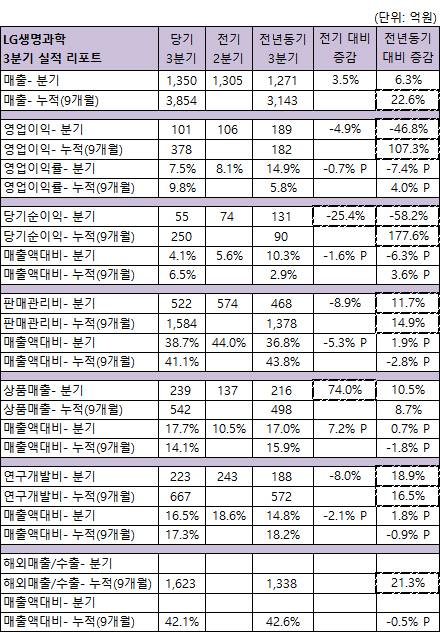 LG생명과학이 올해 3분기 누적 전년대비 22.6% 성장한 3,854억원의 매출을 올렸다(3분기 전년 3분기 대비 6.3% 증가 1.350억)
