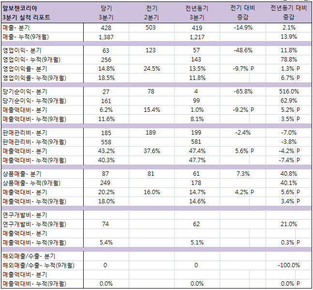3분기 순이익은 전기대비 51억 감소(영업이익 60억 감소), 전년대비 22억 증가(법인세 11억 감소, 영업이익 7억 증가)했다(누적=영업이익 112억 증가, 잡이익 23억 감소, 금융자산처분이익 13억 감소, 법인세 14억 증가로 전년대비 62억 증가)