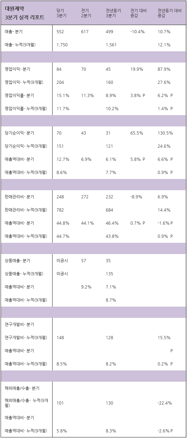 대원제약은 올해 3분기 누적 1,750억원의 매출을 달성, 전년동기대비 12.1% 성장했다고 밝혔다.
