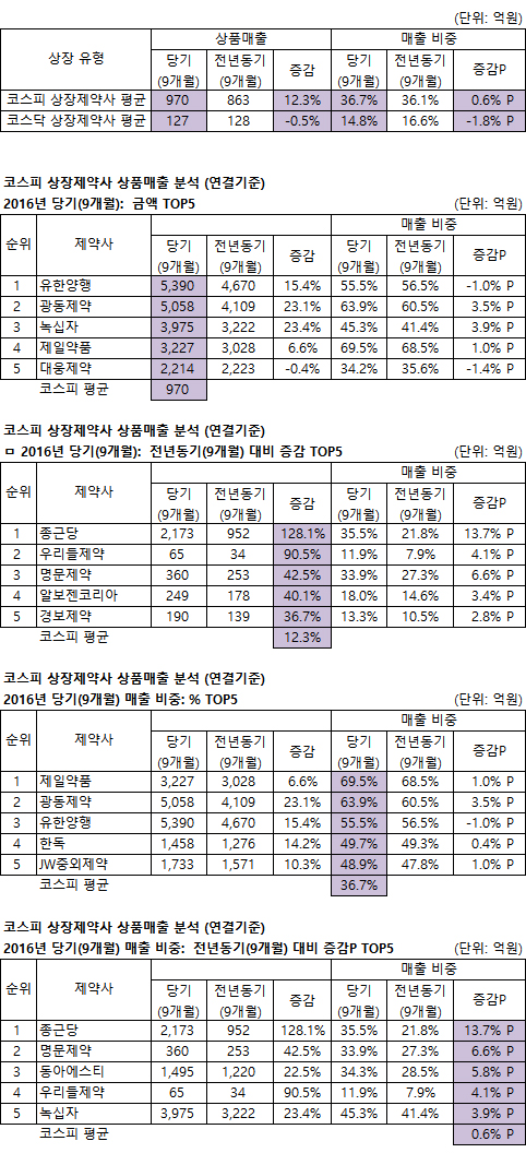 제약사별로 전년대비 유한양행은 721억(간염치료제 '비리어드' 228억 증가, 에이즈치료제 '스트리빌드' 194억 증가, 당뇨치료제 '트라젠타' 110억 증가, 고협압치료제 '트윈스타' 76억 증가), 광동제약은 949억( MRO 611억 증가, 식품 225억 증가), 녹십자는 753억( 한국BMS제약과 B형간염치료제 '바라크루드' 2015년 9월 1일 코프로모션 개시, 한국알콘과 OTC품목 2016년 1월 1일 개시), 제일약품은 199억(고지혈증치료제 '리피토' 203억 증가) 각각 증가했다. 대웅제약은 전년비 9억 감소했다.